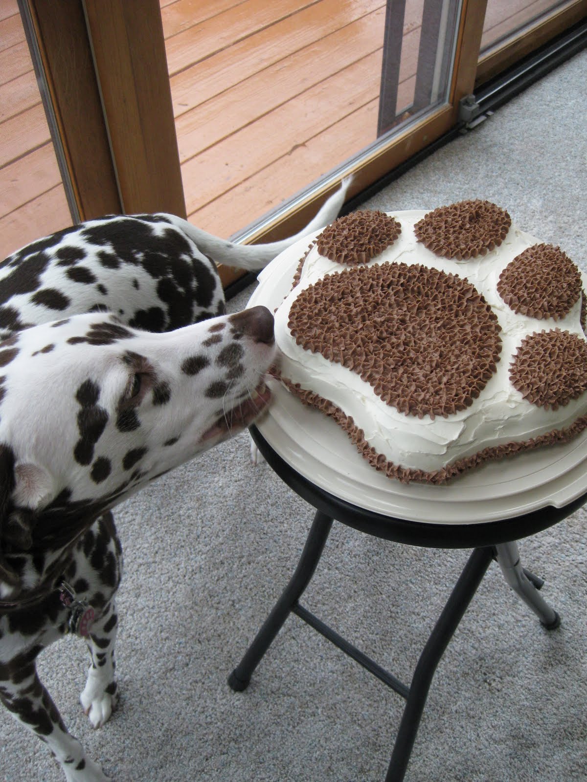 Here's Jazz sampling her birthday cake. Now, I don't think I've ever baked a cake for my husband's birthday, but Betty Crocker would have been proud of this cake! It's made with natural peanut butter and carrots and has a cream cheese frosting. The "chocolate" icing was made with carob powder, so it's all safe for the dogs.